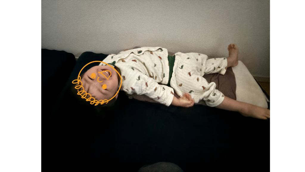 寝かしつけする時はこんな感じで寝ているはずなのに・・・
