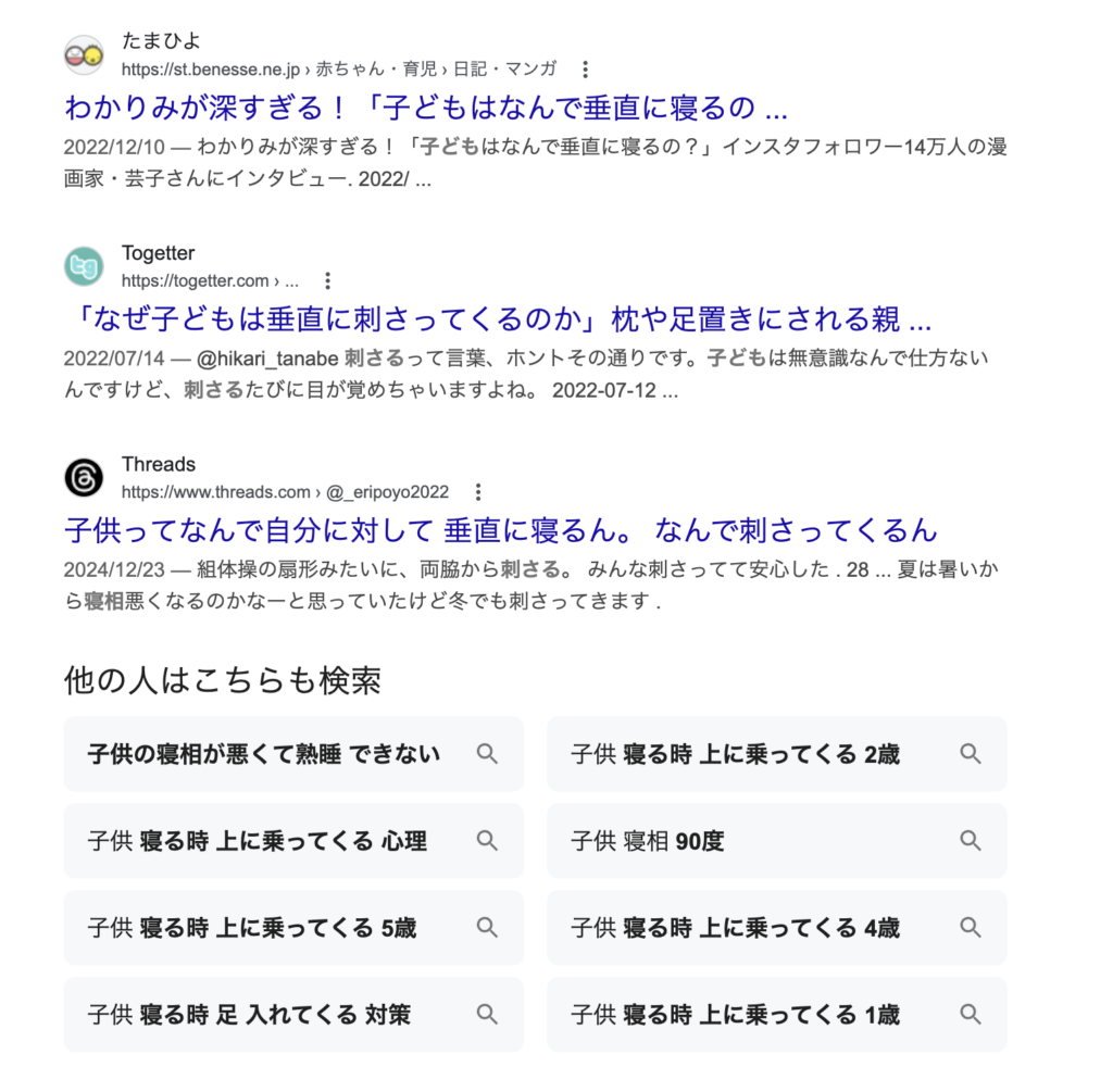 「なんでこどもって垂直に親に突き刺さって寝るの!?!?」