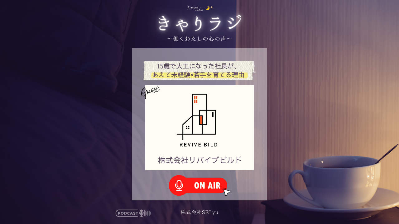 blog ・新着一覧 ・ New articles 【きゃりラジ】ゲスト:KCJ GROUP 株式会社「こどもに『気づき』を届けたい、が最強のスキル。1年越しのリベンジの実話と、キッザニアで働く本当のやりがい」 2025.12.15 【きゃりラジ】ゲスト:株式会社pluszero「“数学が好きすぎる”東大院卒の研究者が、AIベンチャーの社長として描く未来地図」 2025.12.6 【きゃりラジ】ゲスト:株式会社リバイブビルド「スキルより“向上心”!? 15歳で大工になった社長が、あえて未経験×若手を育てる理由」 2025.12.1 すべての記事を読む >> タグ検索#きゃりラジ (36) #もやっと体験談 (2) #インナーブランディング (2) #エンゲージメント向上 (5) #オンボーディング (2) #キャリア (36) #企業ブース出展 (1) #企業展示会 (1) #企業展示会参加レポート (1) #体験談 (31) #働き方 (36) #情報共有 (2) #新入社員 (2) #社内ラジオ (10) #社内報 (1) #育休 (1) #育休後の離職防止 (2) #離職率低下 (6) ・SELyu 記事一覧 ・ セリュー マンション総合EXPOに参加しています! 2025.6.4 社内ラジオちあふる販売パートナー大募集!(1次) 2025.5.19 日本の人事部掲載のお知らせ 2025.5.12 すべての記事を読む >> タグ検索#きゃりラジ (36) #もやっと体験談 (2) #インナーブランディング (2) #エンゲージメント向上 (5) #オンボーディング (2) #キャリア (36) #企業ブース出展 (1) #企業展示会 (1) #企業展示会参加レポート (1) #体験談 (31) #働き方 (36) #情報共有 (2) #新入社員 (2) #社内ラジオ (10) #社内報 (1) #育休 (1) #育休後の離職防止 (2) #離職率低下 (6)