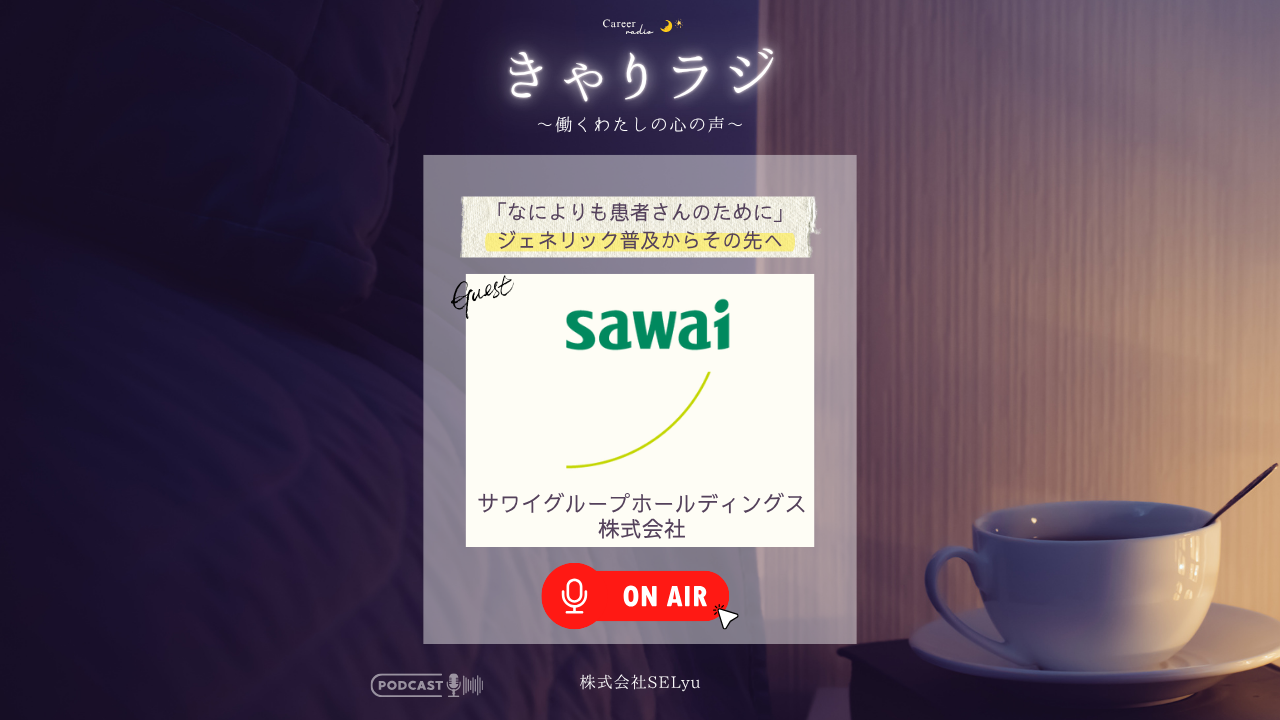 🎙️ゲスト:サワイグループホールディングス株式会社グループ人事部 萬代陽さん 今回のきゃりラジは、ジェネリック医薬品のリーディングカンパニーである沢井製薬(サワイグループホールディングス株式会社)から、グループ人事部の萬代陽さんをお迎えしました。 90年以上の歴史を持つ製薬会社と聞くと、「堅実」「慎重」といったイメージを持つかもしれません。しかし、萬代さんが入社して感じたのは、予想を裏切る「スピード感」と「挑戦」の風土でした。 「なによりも患者さんのために」という揺るぎない理念のもと、変化し続ける沢井製薬の現在地と未来について、入社半年のフレッシュな視点で語っていただきました。 💊 「なによりも患者さんのために」 全社員に浸透する共通言語 萬代さんは、人材サービス会社や人事コンサルタントを経て、2025年4月に沢井製薬へ入社しました。 数ある企業の中で沢井製薬を選んだ決め手は、企業理念への深い共感でした。 「私はもともと『人がいきいきと働く社会を作りたい』という思いがありました。沢井製薬の『なによりも患者さんのために』という理念は、私の軸ともすごく共感するものでしたし、実際に社員の納得感も高く、みんながこれを思いながら仕事をしていると感じます」 (萬代さん) Spotify「きゃりラジ〜働くわたしの心の声〜」より 2007年に制定されたこの理念ですが、それ以前から脈々と受け継がれてきた精神を言語化したもの。社内の発信や日々の会話の端々にもこの言葉が登場し、社員一人ひとりの判断基準として深く根付いています。 🚀 製薬会社のイメージが変わる?「意思決定の速さ」と「挑戦」 異業種から転職してきた萬代さんが、入社後に一番ギャップを感じたこと。それは「スピード感」でした。 「勝手なイメージで、製薬企業は意思決定がゆっくりなんじゃないかと思っていました。でも実際は、経営陣も含めて意思決定がすごく早いんです。ジェネリック医薬品は開発スパンが短いという特性もありますが、業界自体が変わっていかなければならない中で、トライ&エラーを繰り返しながらどんどん挑戦している印象です」 (萬代さん) Spotify「きゃりラジ〜働くわたしの心の声〜」より 「安かろう悪かろう」の誤解を解くための啓発活動や、800品目もの医薬品の安定供給など、ジェネリック医薬品の普及に尽力してきた同社。現在は、そ