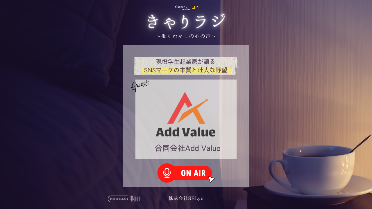 🎙️ゲスト: 合同会社Add Value代表 藤田隼人さん 今回のきゃりラジは、SNSマーケティングを手掛ける合同会社Add Valueの代表、藤田隼人さんをお迎えしました。 藤田さんは、なんと現在21歳で現役の大学3年生。それでいて、ご自身の会社はすでに2期目を迎えています。「なぜ学生起業を選んだのか?」その原点にある高校時代の衝撃と、SNSスクール全盛の時代に「スクール上がりとは違う」と断言する、実績に裏打ちされた彼の鋭い視点、そして壮大な未来の展望に迫ります。 🔥 「就職したら、安定が精神安定剤になる」高校3年生で決めた、起業への道 藤田さんが「起業家」という道を意識したのは、高校3年生の春。それまでは野球に打ち込む日々でしたが、ある起業家のYouTube動画を見て、その自由な生き方に衝撃を受けます。 「『いい大学に行って、いい企業に就職しなさい』というのが当たり前だと思っていた時に、経営者という生き方を見て、自分はこっち側の方が後悔しないな、と。大学進学が決まった直後から、すぐにInstagramのアフィリエイトを始めました」 (藤田さん) Spotify「きゃりラジ〜働くわたしの心の声〜」より なぜ、大学卒業を待たなかったのか。その理由は「熱が冷めてしまうから」。「一度就職したら、その安定が精神安定剤になっちゃって、もう起業しないだろうなと思った」と語る藤田さん。その熱量のまま、大学2年生で法人を設立しました。 💬 「自分のアカウントを伸ばせない人が、他人を伸ばせるわけがない」 藤田さんがSNSマーケティングで起業したのは、アフィリエイトで月30万円を稼いだ自身の「成功体験」があったから。だからこそ、昨今のSNS運用代行やスクールビジネスには、極めて「尖った」視点を持っています。 「いつも疑問なんですけど、自分のアカウントを伸ばしたことがないのに、他人のアカウントは伸ばせないと思うんですよ。クライアント様のアカウントを自分の練習台にするなんて、無責任でありえない。本当に稼げるノウハウなら、他人に教えないはずなんです」 (藤田さん) Spotify「きゃりラジ〜働くわたしの心の声〜」より 藤田さん曰く、アカウントを伸ばす本質はたった一つ。「自己満足のコンテンツは伸びない。いかに“相手目線”で、ユーザーが何を欲しがっているかを考えてコンテンツを作れるか」。た
