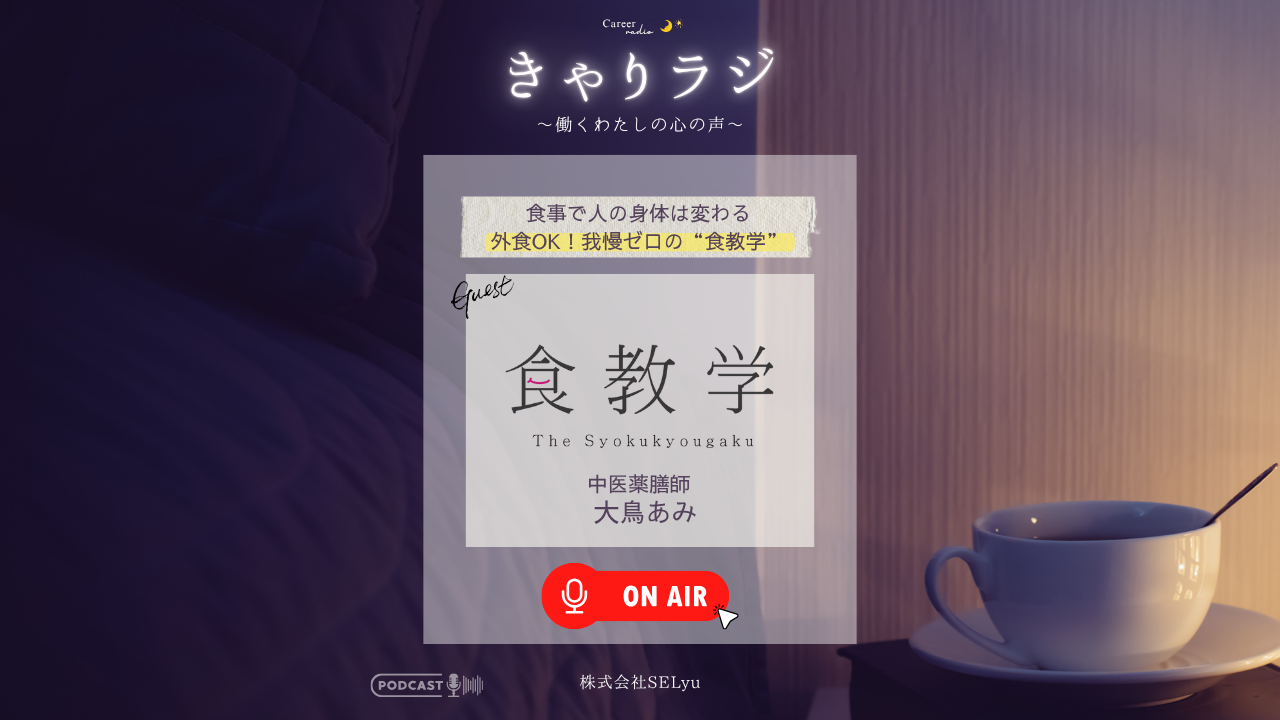 🎙️ゲスト: 中医薬膳師/オーガニック健康カウンセラー大鳥あみさん 今回のきゃりラジは、中医薬膳師・オーガニック健康カウンセラーとして活躍する大鳥あみさんをお迎えしました。 20代で難病(バセドウ病)を患った経験を原点に、独自の体質改善メソッド「食教学」を確立した大鳥さん。その活動の原点にある想いと、「人生を変える食の力」に迫ります。 🌱 「臓器摘出か、一生投薬か」どん底で気づいた、食事が原因という事実 「食教学」の原点は、大鳥さん自身の壮絶な闘病体験にあります。 「もともと私は健康に一切興味がなく、マグロの研究がしたくて東大大学院にいたほど。当時はドーナツ屋さんでバイトしていて、3食ドーナツで生活する日もあるくらい無知でした」 (大鳥さん) Spotify「きゃりラジ〜働くわたしの心の声〜」より そんな生活の中、20代半ばでバセドウ病を発症。処方された薬が体に合わず悪化し、「臓器を摘出するか、一生投薬を続けるか」という選択を迫られます。どん底の中、「なったからには原因があるはず」と突き詰めた結果、その原因が「食事」にあると気づきました。 📖 マグロ研究の知識×中医薬膳学。3年間の“人体実験”で確立した「食教学」 そこから、大鳥さんの「人体実験」が始まります。マクロビオティック、アーユルヴェーダなど、あらゆる食事法を3年かけて自らの体で試し、最終的に「中医学」に辿り着きました。 「中医学の『食事で体を整える医者が一番優秀』という考えに感銘を受け、夢中で学びました。そして、元々持っていた生物科学(マグロの筋肉研究)の知識と、東洋医学の体質分析を組み合わせたら、もっと深く体を変えられるのでは、と。このオリジナルメソッドを『食事を教える』と書いて『食教学』と名付けました」 (大鳥さん) Spotify「きゃりラジ〜働くわたしの心の声〜」より   「食教学」は、自身の病気を乗り越えた経験と、科学的知見、そして東洋医学の叡智が融合した、唯一無二のメソッドなのです。 🍻 外食はエンターテイメント! 外食もお酒も我慢しないのが食教学スタイル。 「食」での体質改善というと、厳しい食事制限をイメージしがち。しかし、大鳥さんは「我慢はしない」と断言します。 「私自身、食事法にハマりすぎて『食べられるものがない』と、食べることが怖くなった時期があります。それでは人生が楽しくない。だから