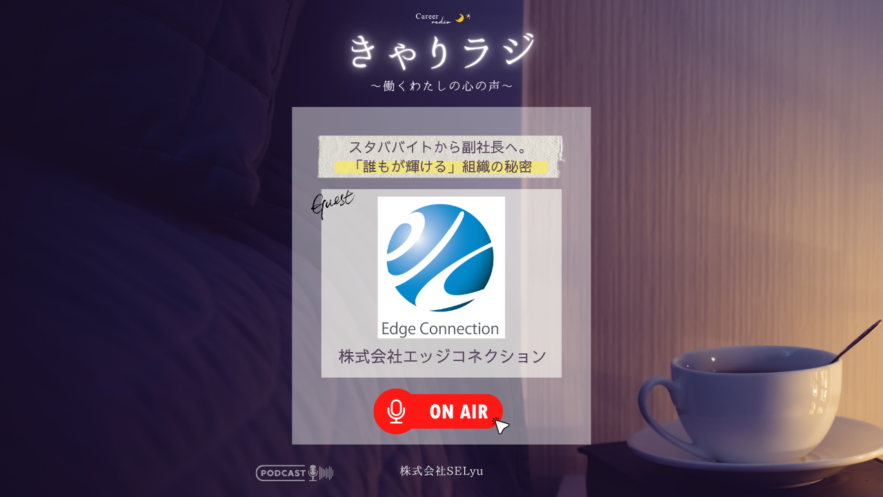 🎙️ゲスト: 株式会社エッジコネクション副社長 趙美紀さん 今回のきゃりラジは、企業の営業・人事・財務課題をサポートする株式会社エッジコネクションから、副社長の趙美紀さんをお迎えしました。 スターバックスのアルバイトから飲食店の店長を経て、未経験のコンサル業界へ。そして入社9年で副社長へと駆け上がった趙さんのユニークなキャリアパス。その背景には、エッジコネクションならではの成長環境と、管理職の7割以上を女性が占めるという、誰もが輝ける組織作りの秘密がありました!   ☕️スタバの経験が原点?「人の支援」を軸に選んだ、成長できる場所 趙さんのキャリアは、新卒で入った不動産会社を半年で退職し、スターバックスのアルバイトから再スタートするという、異色の経歴から始まります。 「スターバックスを経て飲食店の店長を務める中で、個人向けのサービスはやりきった感覚があり、次は企業向けの仕事で、もっと大きな『人の支援』に関わりたいと思いました。エッジコネクションの面接で代表と話した際、企業の社長や事業部長と直接関わりながら課題解決をしていく仕事内容に『面白そう!自分が成長できそうだ』と直感し、入社を決めました」 (趙さん) Spotify「きゃりラジ〜働くわたしの心の声〜」より 入社後は営業としてキャリアをスタート。代表の直下で働き、「ハイスペックな辞書」のような代表に質問攻めをしながらスキルを吸収し、トップランナーへ。その後、チームリーダー、拠点統括、そして人事や広報といったミドルオフィスの立ち上げを経て、副社長に就任。常に「成長」を求め、自ら機会を掴み取ってきた軌跡が、エッジコネクションのカルチャーを物語っています。 💖 「思いやり」だけじゃない。数字で支える、女性が安心して活躍できる仕組み エッジコネクションでは、社員の約7割、管理職の7割以上を女性が占め、子育て中の社員や育休からの復帰者も多く活躍しています。その背景には、単なる「思いやり」だけではない、ロジカルな制度設計がありました。 「子育て中は急な休みも必要になります。一般的な会社だと『迷惑をかけてしまう』と気を遣いますが、当社では休んだ人の業務をカバーした分が、きちんと評価として数字に還元される仕組みがあります。『ごめんなさい』だけでなく『カバーありがとう!売上にもなったよ!』と気持ちよく言える。だからこそ、本当の意
